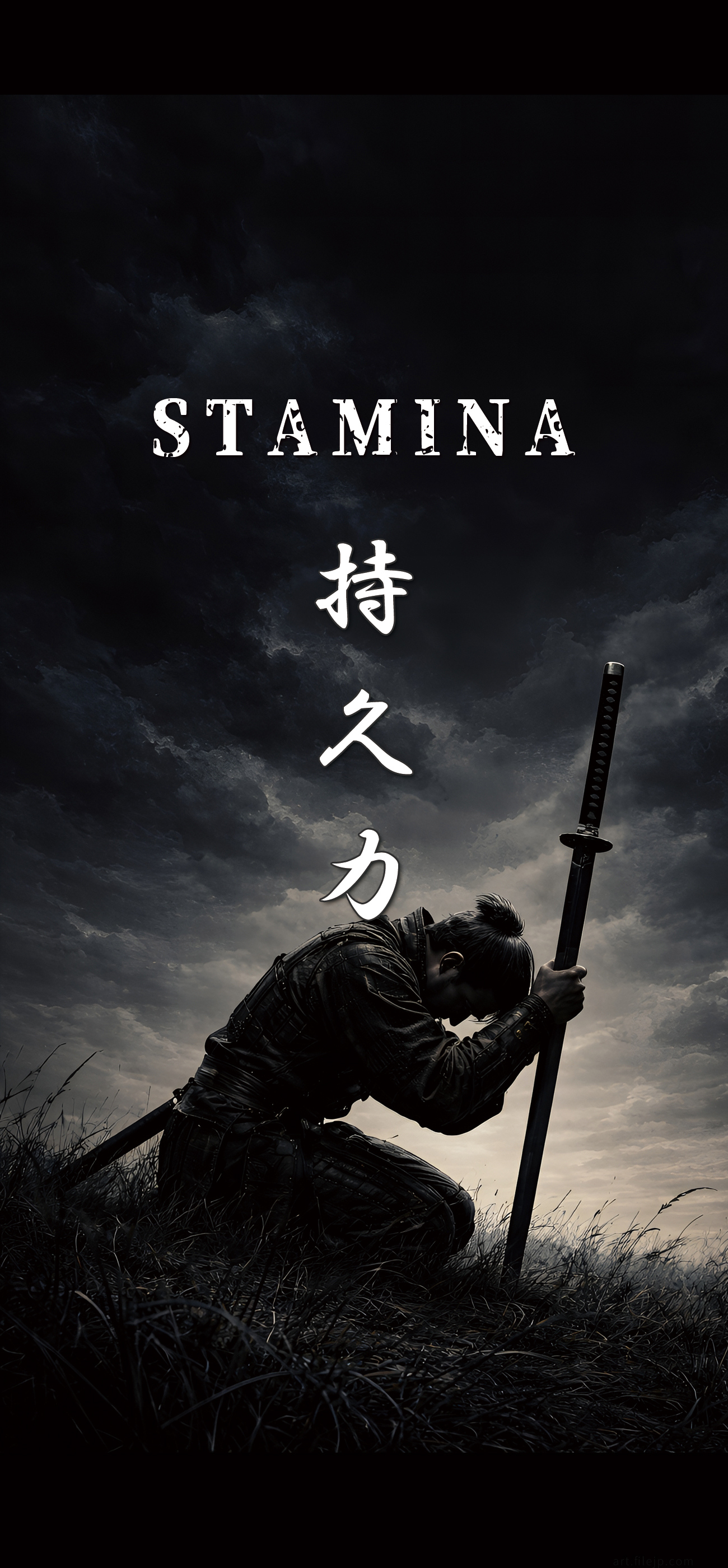 過酷な戦いの中で刀を支えにする侍。その休息は次への持久力を高めるための儀式。高品質なアートが、あなたの再起と継続をサポートする力強い待ち受けになります。
