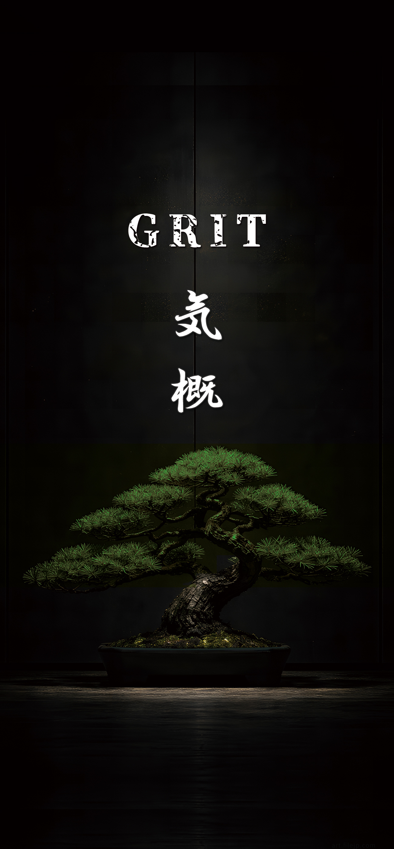 暗闇の中で一際存在感を放つ松の盆栽。それは長い年月を耐え抜き、美しさを昇華させた命の結晶です。本作は、英単語のGritと毛筆の日本語漢字を大胆に配置した、芸術性の高いスマホ壁紙です。モノクロームに近いミニマルなデザインは、画面を見るたびにあなたの心を落ち着かせ、目標に向かって突き進むための静かなエネルギーを補給してくれるでしょう。