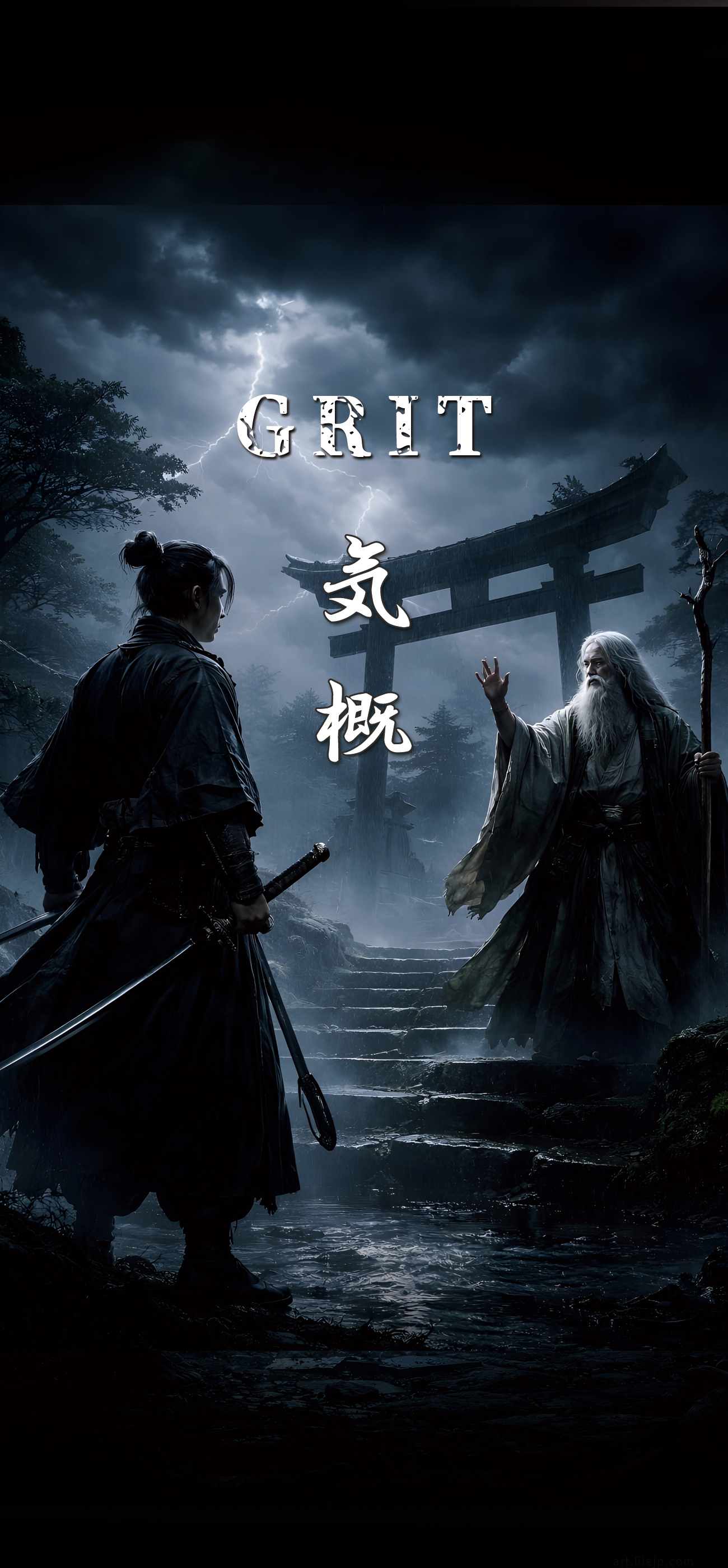 This artistic composition highlights the dramatic encounter between an old sage and a young warrior under a lightning-lit sky. It symbolizes the transmission of wisdom and the inner strength required to face life’s storms. The blend of English and bold kanji creates a striking visual that promotes mindfulness. This wallpaper is a tribute to those who value the journey of learning and the persistent spirit of Grit.